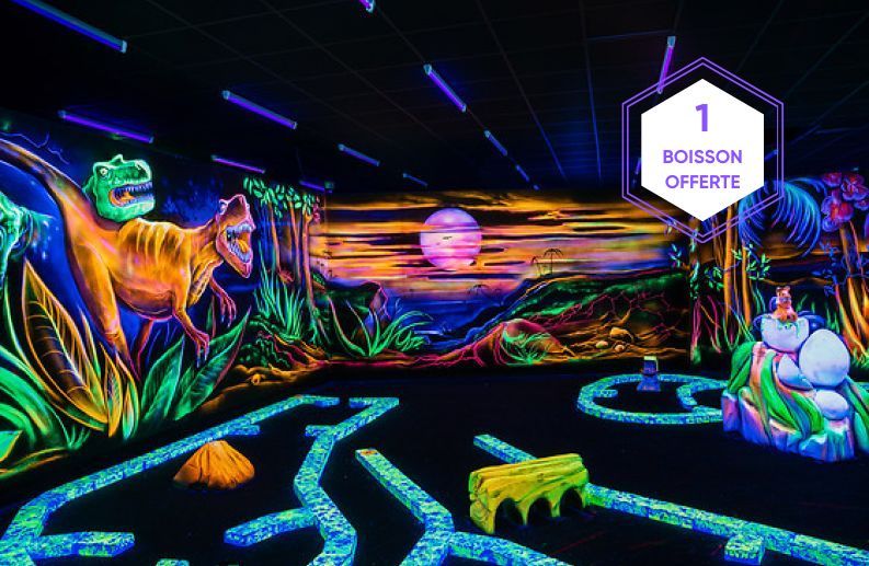 GOOLFY est un nouveau concept innovant et unique sur Montpellier : pour Enfants et Adultes, un parcours de minigolf indoor sur 450m² en lumière noire sur le thème des espèces menacées et des dinosaures en décors 3D tout en fluo.